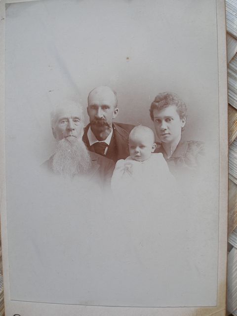 I believe this is a photo of James Powers with his son Wesley J. Powers and his wife Jenny Marsden and their new baby. If the baby is Mabelle, the photo would be from about 1870.