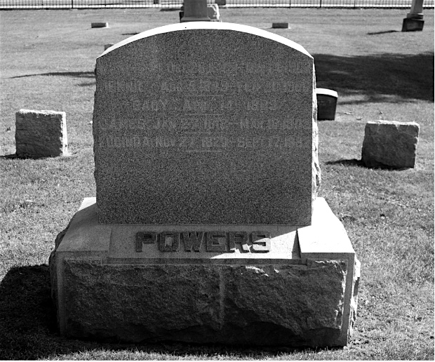 Grave stone of James Powers and family located in North Cemetery, At. Charles, Illinois. I am unable to read the first name but it appears to be Wesley Powers . This is followed by Jennie (1849-1906) who I believe is the wife of Wesley J. Powers (a son of James) but the birth date must be 1849. Then a baby of Jennie, died 1889. Then James Powers (1818-1908) and his wife Lucinda (1829-1882).