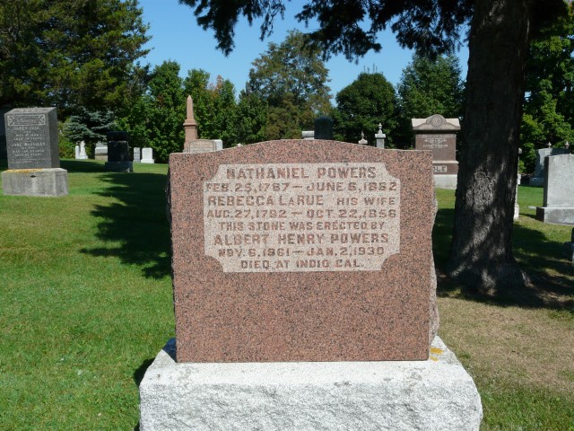 Nathaniel Hart Powers and Rebecca LaRue married in Canada in 1809 and by 1811 had moved to the USA. They returned to Leeds County around 1820 and then in 1830 moved to Durham County, settling around the village of Kirby. They had the following children: