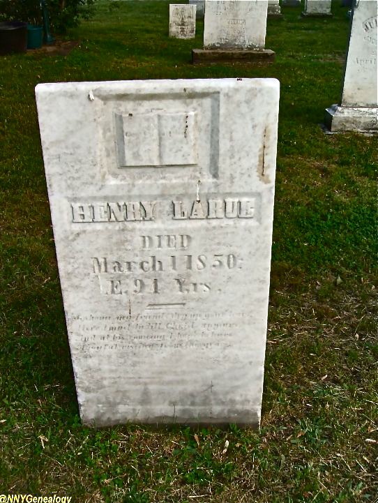You can find a great deal of information on the web regarding this family so I will provide a summary of relevant material of interest to this family history. Our interest lies with Hendrick (Henry) Larue (1755-1850) and Marritje Mandeville (1753-1806). The Mandeville family arrived in the USA around 1647 and the LaRue family (variously spelled Le Ruex, Laroe and others) in 1670 with the arrival of three children of Pierre LeReux (he apparently dying on the ship): Abraham, Suzanna and Jacques. Both families were French Huguenots (Calvinists) and under persecution for their religion. The families settled in what became New Jersey and New York. The son of relevance to our story was Jacques who had 13 children, one of them a Hendrick who had at least 9 children, one of whom was Jacobus who had at least 5 children, one of them Hendrick (1755-1850).